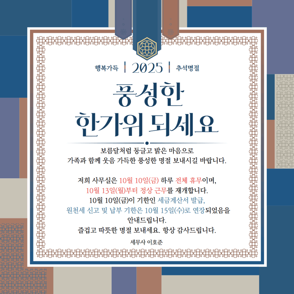 10월은 세무 일정이 많은 달인 만큼, 원천세 신고, 간이지급명세서 제출, 그리고 3분기 부가가치세 예정신고를 철저히 챙기셔야 합니다.